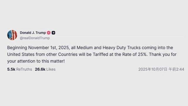 トランプ氏は先月、大型トラックを対象に10月1日から25%の追加関税を課すと表明していました。その発動を1か月遅らせたうえで新たに中型トラックにも対象を拡大したかたちです。