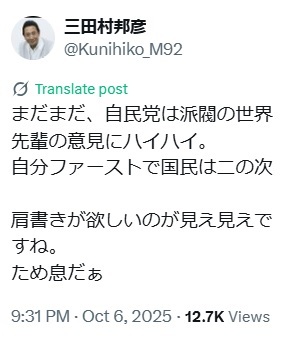 俳優の三田村邦彦(71)が7日までにX(旧ツイッター)を更新。総裁選を終えた自民党に厳しい目を向けた。