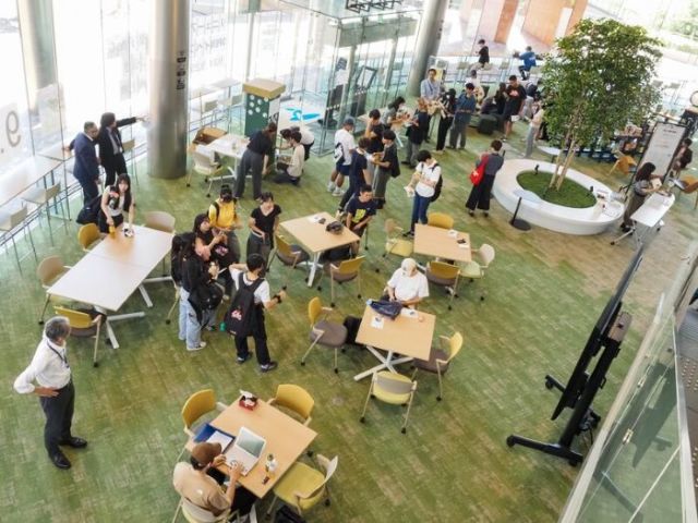天井が高いガラス張りの開放的な構造を生かし、中央に4メートルのシンボルツリーを配置した。仲間が集まって課題に取り組んだり、セミナーやワークショップに参加したりするなど、1人でもグループでも心地よく過ごせる場を提供する。