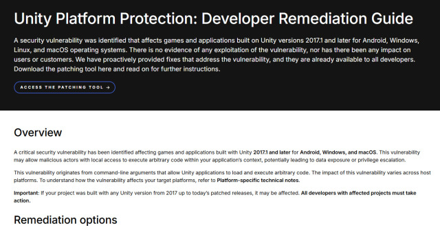 脆弱性が悪用された形跡は2日時点でなく、ユーザーや顧客への影響も確認していないとしている。同社は対策として、パッチを適用した各バージョンのUnity開発環境や、ビルド済みアプリ用のパッチャーを提供しており、開発者に対しこれらによる対処を呼び掛けている。