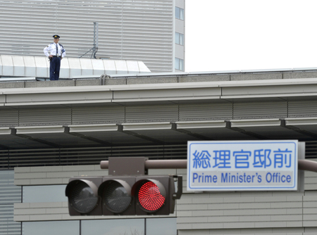ドローン落下事件を受け、首相官邸の屋上を警備する警察官=2015年4月、東京都千代田区