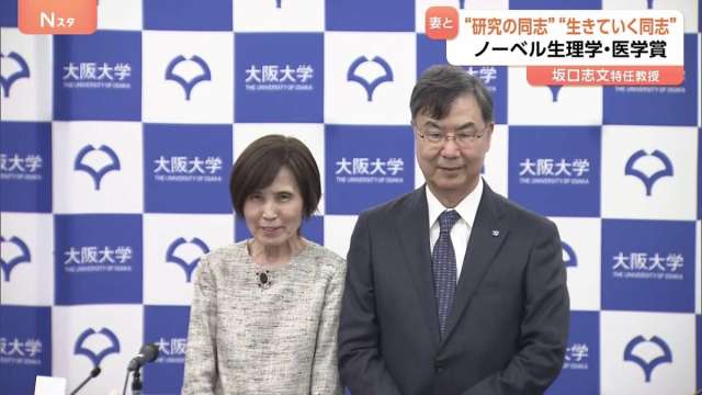 ノーベル生理学・医学賞に選ばれた大阪大学の坂口志文特任教授。「研究の同志」と称えた妻とともに会見に臨みました。
