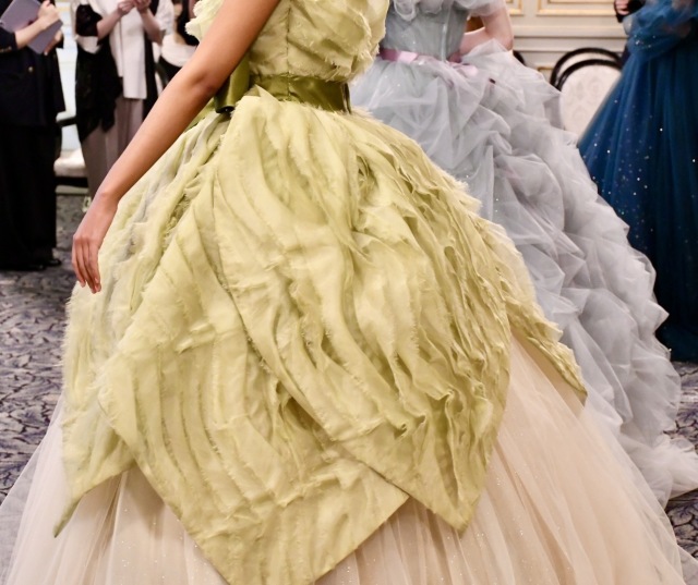 ファッションショーでは、歩いたりドレスをひるがえしたりするたびにドレス全体が光を反射してキラキラときらめく様子を披露。その美しさに思わずため息がでるほどでした。