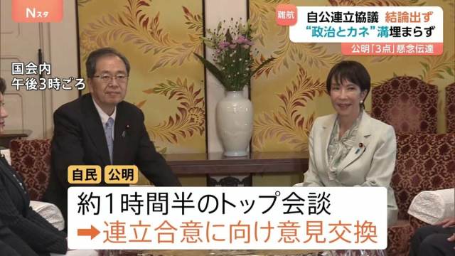 自民党の高市総裁はきょう、連立政権の合意をめぐり公明党の斉藤代表と会談しましたが、「政治とカネ」の問題について認識の溝は埋まりませんでした。