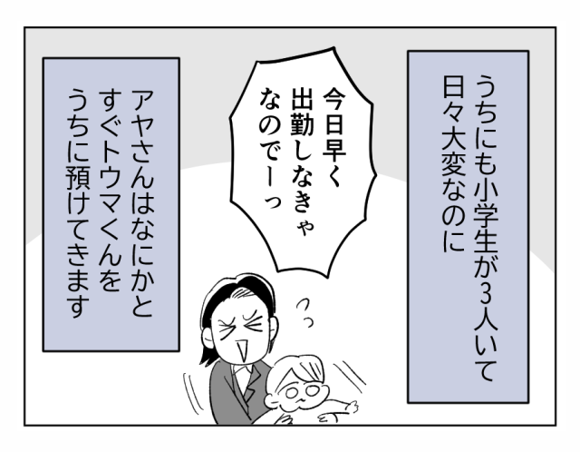 アヤさんもお義母さんに対してはやはり遠慮があるようで、一度断られたら「それでもなんとか!」と強引にはお願いできない様子。となると……次のターゲットはチサトさんになりますよね。アヤさんはチサトさんに対して、ことあるごとに「働くママには周囲のサポートが不可欠なんですよ〜」と意味深に繰り返すようになったそうです。
