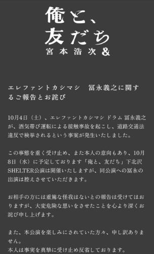 公式サイト内で「10月4日(土)、エレファントカシマシ ドラム冨永義之が、酒気帯び運転による接触事故を起こし、道路交通法違反で検挙されるという事案が発生いたしました」と発表。「この事態を重く受け止め、また本人の意向もあり、10月8日(水)に予定しております『俺と、友だち』下北沢SHELTER公演は開催いたしますが、同公演への冨永の出演は控えさせていただきます」とした。
