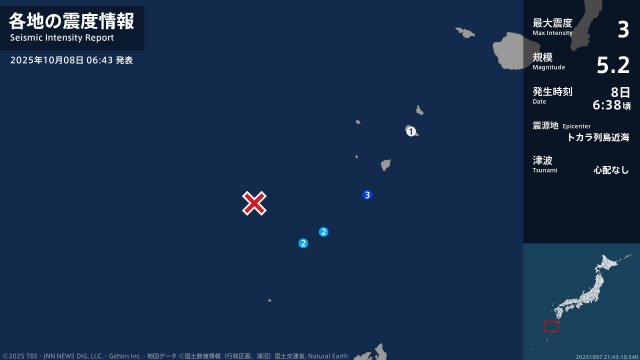 気象庁によりますと、震源地はトカラ列島近海で、震源の深さはごく浅い、地震の規模を示すマグニチュードは5.2と推定されます。
