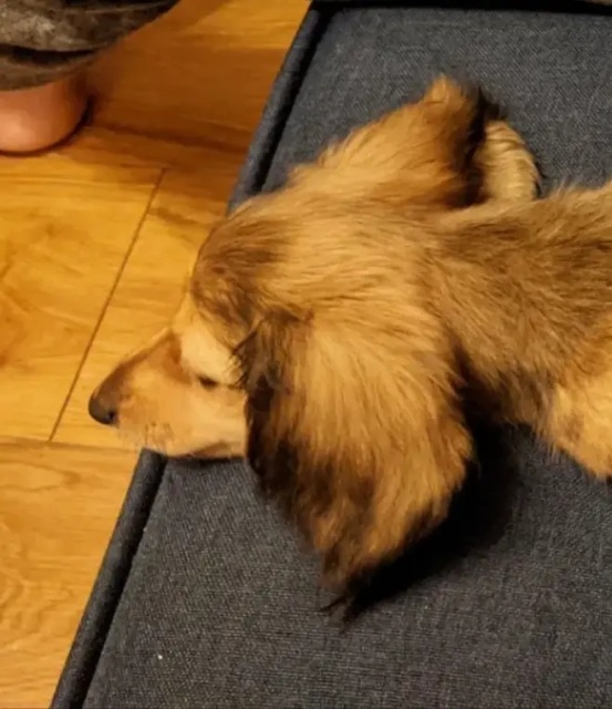投稿には、「アジの開きならぬダックスの開き」「お手手が!!返してるの初めて見ましたーー」「山小屋の床に敷いてある、毛皮?」「こりゃまた いい感じに炙られましたな」「ぱっと見、へそ天かと思ったら、背天 笑」「もしかして…イカかも!?」「美味しそうですね。これはもう日本酒ですかねぇ〜」「耳がいい感じにイカ感かもしだしてる」「毛深いイカでしょうか」ととったコメントが寄せられています。