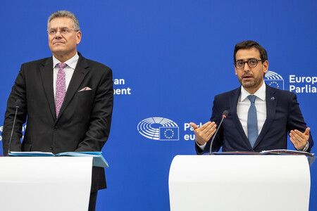 記者会見で鉄鋼に対する関税率引き上げについて話す欧州委員会のセジュルネ上級副委員長(右)とシェフチョビッチ欧州委員=7日、仏ストラスブール(EPA時事) 【ブリュッセル時事】欧州連合(EU)欧州委員会は7日、無関税の輸入枠を超過した鉄鋼に対する関税率を現行の25%から50%に引き上げる方針を発表した。無関税枠も2024年比で半減させる。米国と同水準の関税率とすることで、安価な中国産鉄鋼の流入を抑え、低迷する欧州鉄鋼業の立て直しを図る。実施には加盟国と欧州議会の承認が必要となる。
