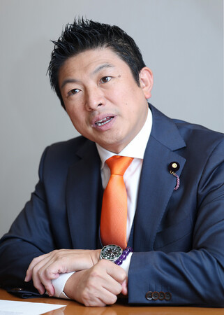 インタビューに答える参政党の神谷宗幣代表=7日、国会内