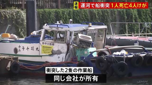 けさ、東京・江東区の運河で2隻の船が衝突し、男性1人が死亡、4人がけがをしました。