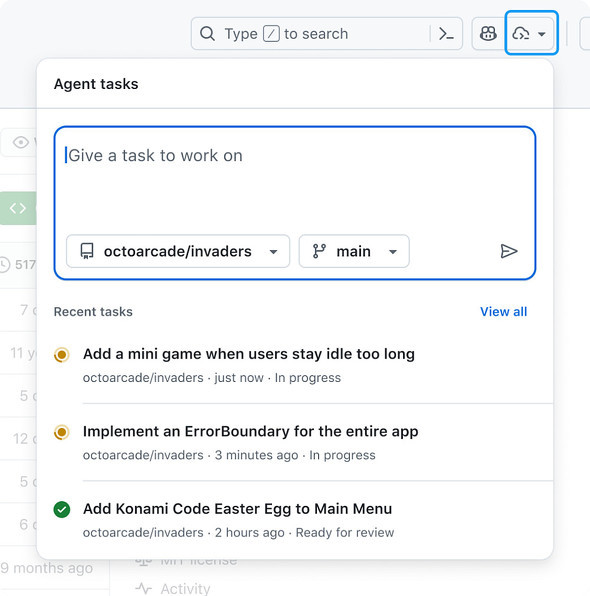 エージェントパネルはナビゲーションバーに追加された「Agents」ボタンから起動できる。開発者は現在作業中のページを離れることなく、エージェントパネルを通じて新しいタスクの登録や進行中タスクの確認が可能だ。依頼したタスクはCoding Agentがバックグラウンドで処理し、完了時にはレビュー用のプルリクエストを自動生成する。