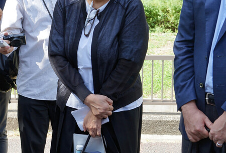 財務省前で報道陣の取材に応じる赤木雅子さん(中央)=8日午前、東京都千代田区 学校法人森友学園への国有地売却に関する公文書改ざん問題で、財務省は8日、改ざんを指示されて自殺した近畿財務局職員、赤木俊夫さん=当時(54)=の妻雅子さん(54)に、財務省職員の手控えや俊夫さんのメール記録など関連文書約2万5000ページを開示した。決定は7日付。開示は4月に始まり、今回で4回目となる。