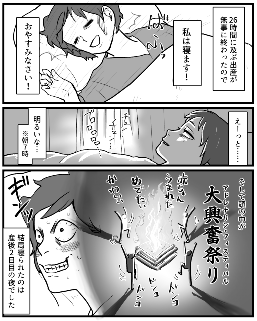 しかし待てども待てども睡魔は一向に訪れず。なんと産後ハイで、ママの頭の中は“大興奮祭り(アドレナリン・フェスティバル)”開催中! わっしょいわっしょい。きちんと眠れたのは産後2日目の夜だったのだとか。あの興奮はなんだったのでしょう。