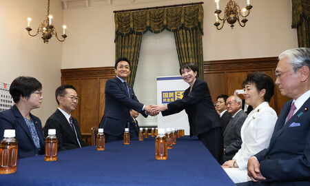 国民民主党の玉木雄一郎代表(左から3人目)と握手する自民党の高市早苗総裁=8日午後、国会内 公明党は9日、中央幹事会などを東京都内で開き、自民党との連立政権継続の是非について協議する。この後、全国県代表協議会を開催し、地方組織の意見を聴取する。公明は自民派閥の裏金事件を踏まえ、企業・団体献金の受け皿を限定するよう主張。事件の全容解明も訴えている。自民の高市早苗総裁は対応を検討しているが、連立合意のめどは立っていない。臨時国会召集は当初想定されていた15日より遅れることが確実になった。