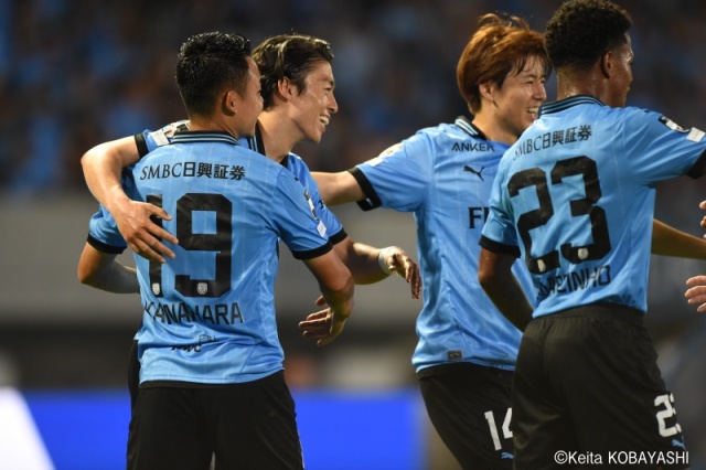 開始早々の10分にスコアが動く。川崎Fは佐々木旭が相手DFラインの背後へロングフィードを供給し、GK小島亨介が頭でクリアしたボールを回収。脇坂泰斗からマルシーニョと繋ぎ、山本悠樹がミドルシュートを放つと、ディフレクトしたボールがネットを揺らして先制に成功した。23分には相手選手のクリアボールを拾ったファンウェルメスケルケン際がボックス手前中央から右足の強烈なミドルシュートをゴール左隅に突き刺し、リードを2点に広げる。