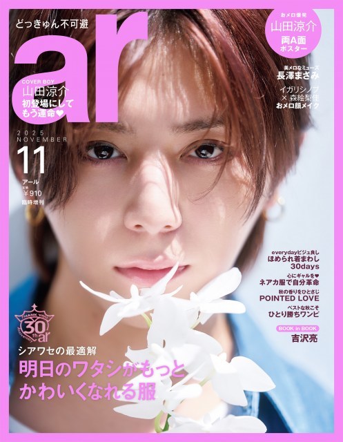 『ar』11月号臨増版に登場する山田涼介 Hey! Say! JUMPの山田涼介が、10日発売のファッション誌『ar』11月号(主婦と生活社)30周年アニバーサリー号の臨増版の表紙を飾っている。初登場にして初カバーの山田が、ふんわり甘いピンクコーデややんちゃな雰囲気のジャージコーデなど、計6スタイルを披露している。