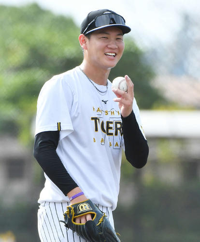 阪神対くふうハヤテ 試合前、キャッチボール中に笑顔を見せる阪神及川(撮影・岩下翔太)<みやざきフェニックス・リーグ:阪神2−2くふうハヤテ>◇9日◇宮崎アイビー