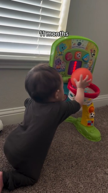 動画は、バスケットボールをはじめて1カ月後と思われる、11カ月の様子からスタート。スーパーマーケットで購入したというおもちゃのバスケットゴールにつかまって、上体を起こしながらダンクシュートを決めました。お見事!