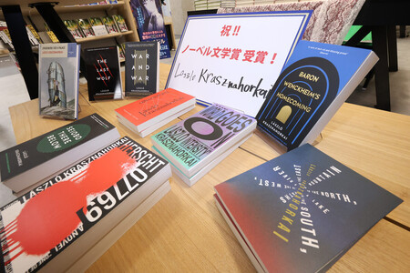 ノーベル文学賞受賞が決まったハンガリーのクラスナホルカイ・ラースローさんの書籍=9日午後、東京都新宿区の紀伊国屋書店新宿本店 ノーベル文学賞発表の9日夜、東京・新宿の紀伊国屋書店新宿本店には20人ほどが集まり、記者会見の中継モニターを見守った。日本に深い縁があるハンガリーの作家クラスナホルカイ・ラースローさん(71)の受賞が決まると拍手も起き、担当者は「受賞を機に手に取って」と話した。