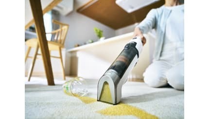 さらに、パワフルなモーターが汚水と空気を分離することによって、吸引した汚水が漏れることなくさまざまな角度で使える。ソファー、カーテン、車のシートの背もたれといった、普段シミ汚れを掃除しにくい場所にも対応し、場所によってアタッチメントを付け替える手間もかからない。