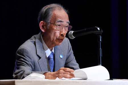 被爆80年イベントで発言する日本被団協の浜住治郎事務局長=11日午後、東京都千代田区 日本原水爆被害者団体協議会(日本被団協)などは11日、東京都千代田区で被爆80年イベントを開催した。この日はノーベル平和賞受賞決定から1年に当たり、約300人の来場者に「核兵器廃絶は過去の話ではなく、今の私たちの話だ」と共働を呼び掛けた。