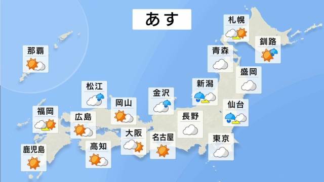 あすは、伊豆諸島は台風の影響で大荒れとなりそうです。関東もところどころで雨が降り、沿岸部では風の強まる所もあるでしょう。東北や日本海側も雨が降りやすく、東北もあすにかけて大雨になる所がある見込みです。東海や西日本は、晴れ間の出る所が多いでしょう。