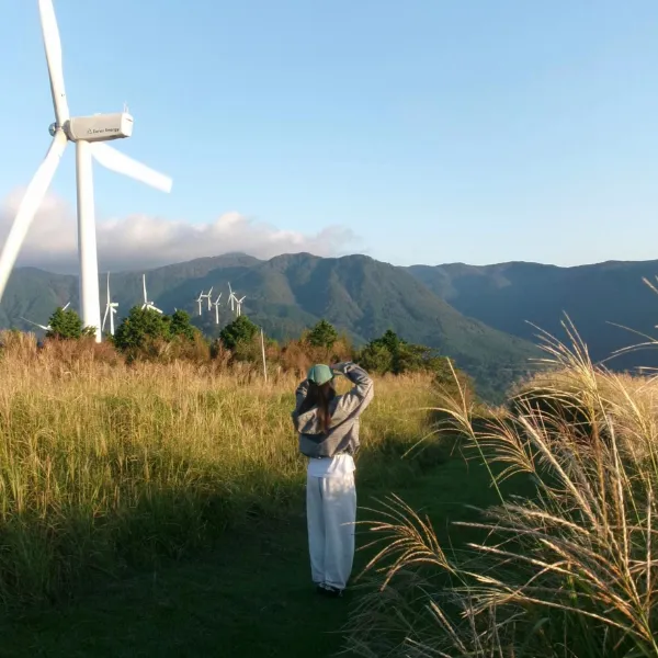 歩いていると見えてくる大きな風車は、「三筋山」山頂付近に建設された「東伊豆風力発電所」の風力発電機。雄大な自然と一緒にカメラに納めると、雰囲気のある写真が撮れるのでおすすめです。