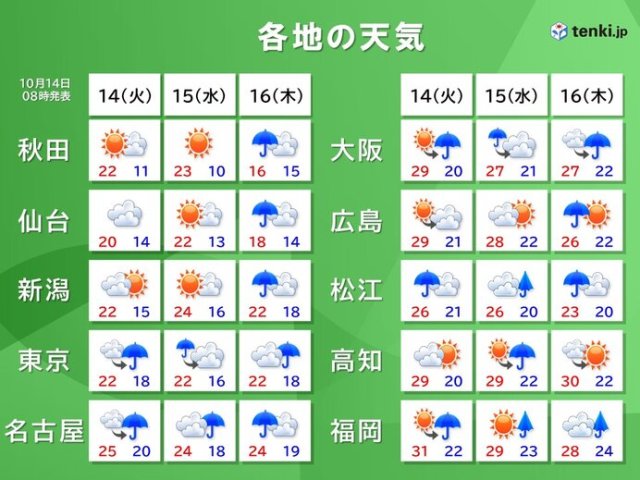 º£Æü14Æü(²Ð)¤ÏÆüËܳ¤Â¦¤«¤é±«¤ÎÈϰϤ¬¹¤¬¤ê¡¢»³±¢¤Ê¤É¤Ç±«µÓ¤¬¶¯¤Þ¤ê¤½¤¦¡£16Æü(ÌÚ)¤ÏËÌΦ¤äÅìË̤òÃæ¿´¤Ë±«¤äÉ÷¤¬¶¯¤Þ¤ê¡¢ÅìË̤ǷÙÊóµé¤ÎÂ籫¤Ë¤Ê¤ë¤ª¤½¤ì¡£±«±À¥ì¡¼¥À¡¼¤Ê¤É¡¢ºÇ¿·¤Î¾ðÊó¤ò³Îǧ¤·¤Æ¤¯¤À¤µ¤¤¡£