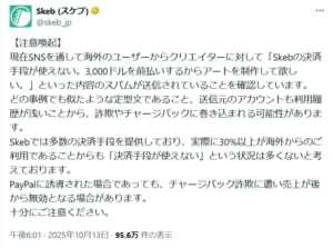 Skebをはじめとするクリエイター支援型プラットフォームは、国や通貨の異なるユーザー間でのやりとりを容易にすることが魅力ですが、同時に詐欺リスクも伴います。海外ユーザーとのやりとりを増やすほど、こうした類の「先払い→チャージバック」詐欺のターゲットになりやすくなります。