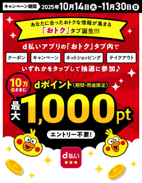 本キャンペーンは「d払い」アプリ内の「おトクタブ」新設を記念したもの。キャンペーン期間中にタブ内のクーポン、キャンペーン、ネットショッピング、テイクアウトいずれかの情報をタップした中から抽選で合計10万人に最大1000ポイントのdポイント(期間/用途限定)を進呈する。