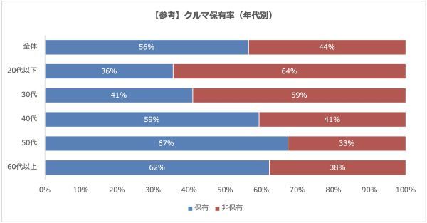 今回の調査では、「クルマを保有している」人が56%、「保有していない」人が44%だった。クルマを保有する理由としては「買い物や仕事で必要」(56%)が最も多くなった。2番目に多かったのは「クルマでの移動・運転が好き」(44%)、3番目は「通学・通勤で必要」(40%)となったが、20代以下は「クルマでの移動・運転が好き」(55%)がトップになるなど、若者のクルマ離れが言われているものの、運転が好きな若者が実は多いことが明らかになった。他方、年代が上がるほど買い物や仕事のためにクルマを保有する比率が高くなる傾向があるが、40代では「家族・親族の送迎」(39%)が他の年代よりも約10ポイント高くなるなど、世代によってクルマを保有する理由に違いがあることがわかる。