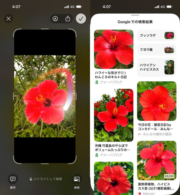 利用シーンとして多いと予想されるのは、まず画像をもとにした検索だろう。スクリーンショットを撮影して表示されるプレビュー画面で、検索したい被写体を指で囲むようになぞり、画面下部をスワイプアップすることで、Google 画像検索を実行できる。Androidにおける「かこって検索」とほぼ同様で、便利な体験として活用できるはずだ。