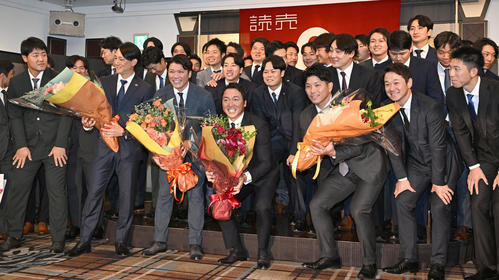 大城卓を先頭に選手、スタッフが次から次へとサプライズで登場。選手、コーチ、スタッフ総勢53人、異例の大所帯で壇上があふれ「おい、おい、来すぎでしょ(笑い)」。今オフ、ポスティングシステムを利用してのメジャー挑戦を球団と本格的に協議する岡本には小声で「いってらっしゃい」と大きな花束を逆サプライズで手渡した。