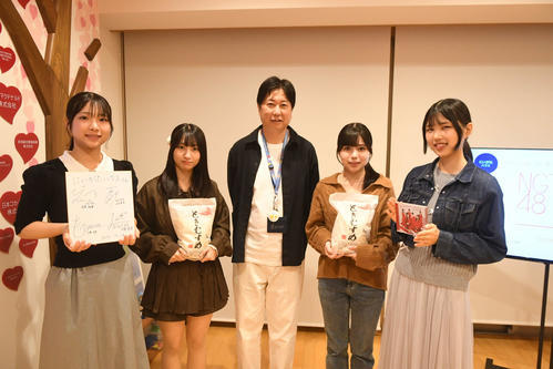 訪れたのは4期生の高島柚愛(15)、5期生の甲斐瑞季(17)、北澤百音(17)、辻田季音(17)。グループで取り組んでいる「農業プロジェクト」で、メンバーが苗の栽培から収穫まで行ったコシヒカリの「ときむすめ」の新米2キロを2袋持参。CDやサイン色紙とともに贈呈した。