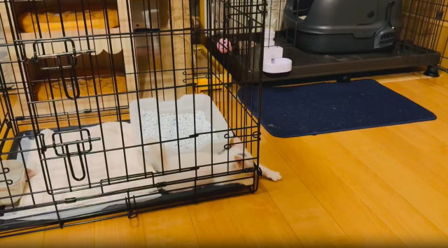 一瞬の間に外へ出てしまったMINTちゃんを目撃し、「え!?」と言いたげに二度見するチョコくん。ケージとMINTちゃんを交互に見てびっくりしているようです。妹の珍行動に困惑するチョコくんの姿がクスッと笑いを誘い、さらにMINTちゃんが“猫は液体”を体現した瞬間には、思わずあっけにとられてしまう映像でした。