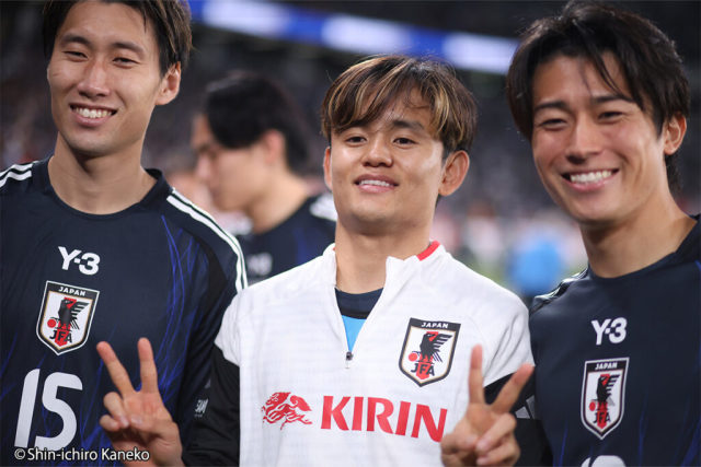 鎌田大地(左)、中村敬斗(右)と共に笑顔を見せる久保建英(中央) 日本代表MF久保建英(レアル・ソシエダ/スペイン)は14日、東京スタジアムで行われた『キリンチャレンジカップ2025』のブラジル代表戦に先発出場。試合後、気になる足首の状態について言及した。