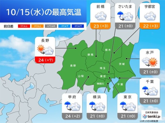 今日15日の関東地方の最高気温は、昨日14日と同じくらいの所が多いでしょう。東京、横浜、千葉、さいたま、水戸は21℃、前橋と宇都宮は22℃の予想です。平年並みの所が多いでしょう。昨日14日とは違って今日15日は日差しがなく、沿岸部などは北よりの風がやや強めに吹くため、一層ひんやりと感じられそうです。薄手のジャケットなど上着を羽織ってお出かけください。