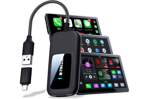 本製品は有線CarPlayの専用ポートに接続すれば利用でき、Android Autoも対応。対応端末はiOS 10以上のiPhone、Android 11以上のスマートフォンで、初回設定後はエンジンをかければ自動接続する。Wi-Fi6規格と2.4/5GHz対応で、市街地でも安定した通信環境を確保できるとしている。