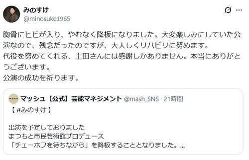 みのすけは自身のXで「胸骨にヒビが入り、やむなく降板になりました」と説明。「大変楽しみにしていた公演なので、残念だったのですが、大人しくリハビリに努めます。代役を努めてくれる、土田さんには感謝しかありません。本当にありがとうございます。公演の成功を祈ります」とつづった。