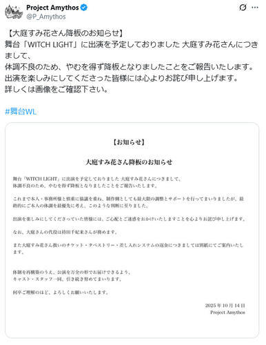 同舞台を主催するProjectAmythosは「舞台『WITCH LIGHT』に出演を予定しておりました大庭すみ花さんにつきまして、体調不良のため、やむを得ず降板となりましたことをご報告いたします。出演を楽しみにしてくださった皆様には心よりお詫び申し上げます」と謝罪。