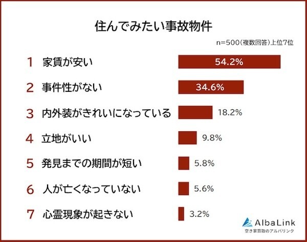 はじめに、住んでみたい事故物件を聞いたところ、「家賃が安い」(54.2%)が最も多い結果に。次いで、「事件性がない」(34.6%)、「内外装がきれいになっている」(18.2%)と続いた。