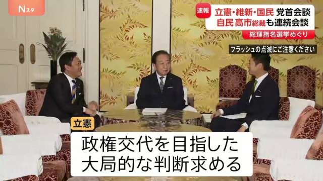 国会では総理指名選挙をめぐり、立憲・維新・国民の党首会談が行われています。国会から中継です。