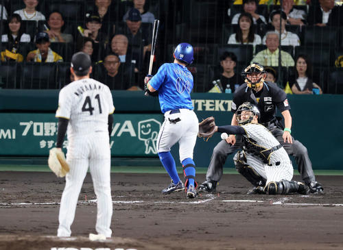 阪神対DeNA 2回表DeNA無死、林は村上のスローボールで死球を受ける(撮影・加藤哉)<セ・CSファイナルステージ:阪神−DeNA>◇第1戦◇15日◇甲子園