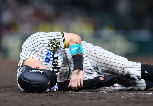 佐藤輝は痛みに顔をゆがめ、グラウンドにあおむけに転がった。球場は一瞬どよめくも、その後問題ない様子でプレーを続行した。