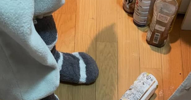 運の悪いことにちょうど足の上に落ちたせいで、靴下がびしゃびしゃに。しかもその拍子に他の物も落としてしまったようで、床にはいちごのパックや調味料のボトル、歯磨き粉などが散乱しています。
