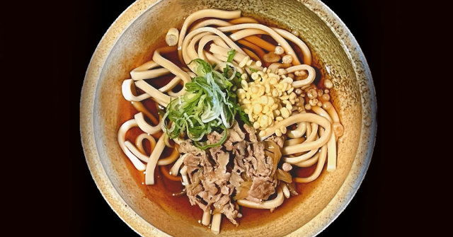 ウドンドは、阪急宝塚線・大阪モノレール「蛍池駅」から徒歩約2分の場所にある。関西では珍しく、「日本一硬い」とも言われる山梨県富士吉田市の吉田うどんをベースにした麺が特徴だ。だしは関東風のしょうゆベースで、黒く仕上げている。