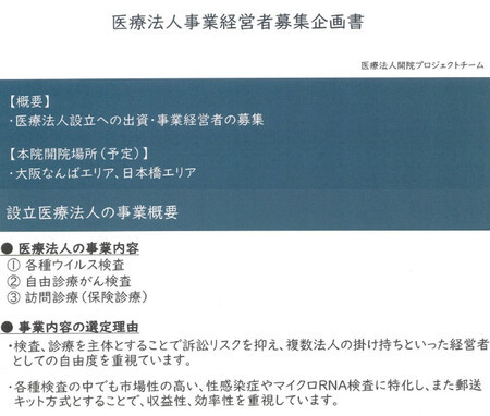 介護関連会社の元代表らが出資を募るために示した企画書(関係者提供) 大阪市で性感染症検査に特化したクリニックを開設すればもうかると言われ出資した東京都と島根県の会社経営者が、出資金をだまし取られたとして、詐欺容疑で介護関連会社元代表に対する告訴状を警察当局に提出したことが15日、関係者への取材で分かった。