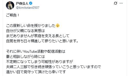 戸谷さんは「それに伴いYouTube活動や配信活動は妻と相談しながら時には不定期になってしまう可能性がありますが夫婦二人三脚で引き続き頑張っていこうと思っていますので温かい目で見守って頂けたら幸いです」と呼びかけた。
