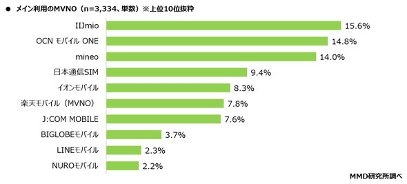 通信契約しているスマートフォンを所有している3万6421人を対象に、メインで利用しているスマートフォンの通信サービスを聞いたところ「MVNO」を契約している割合は9.2%と2025年2月調査から0.1ポイント増加。メイン利用のスマートフォンでMVNOを契約している3334人が契約しているサービスの上位はIIJmioが15.6%、OCN モバイル ONEが14.8%、mineoが14.0%となった。